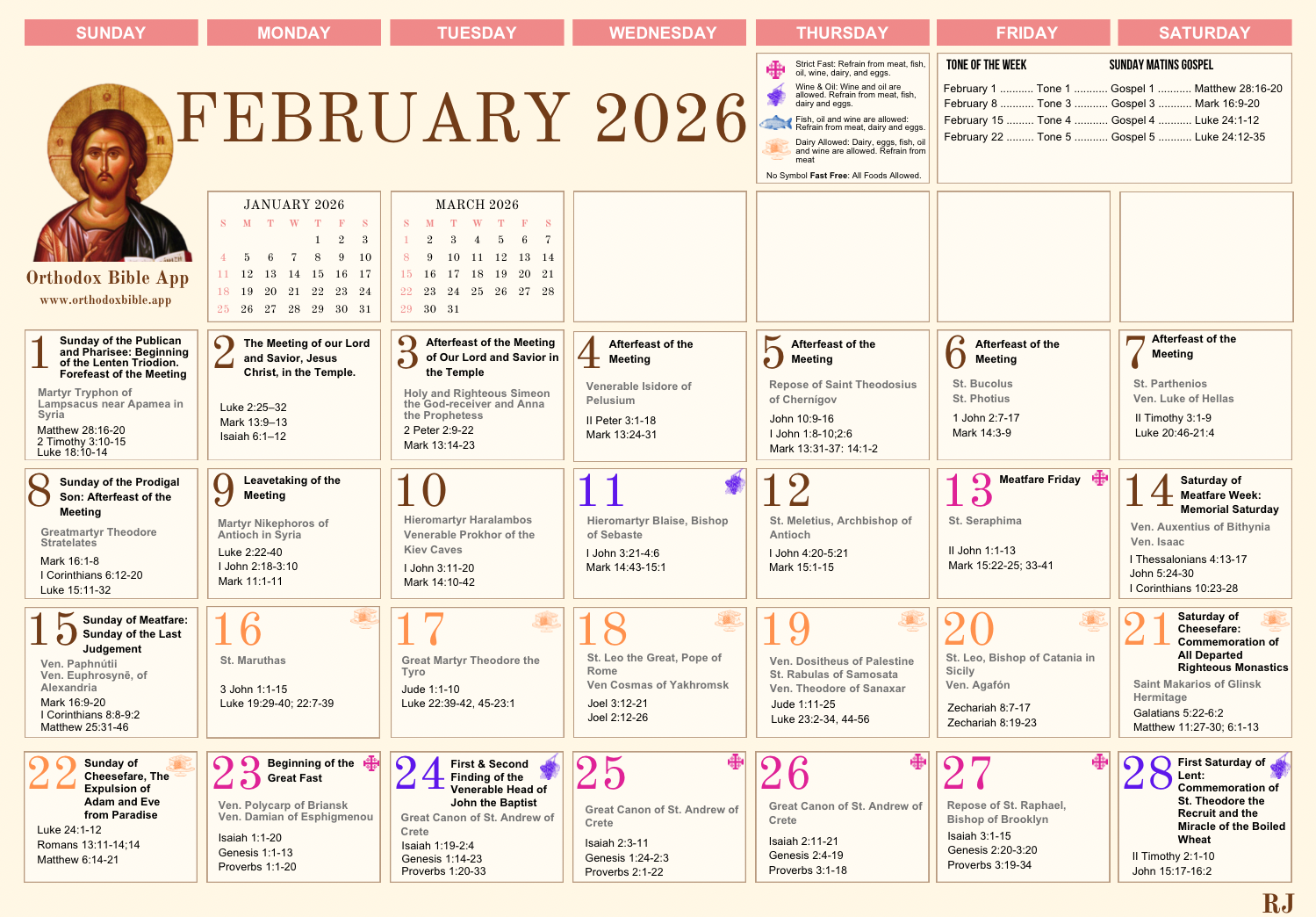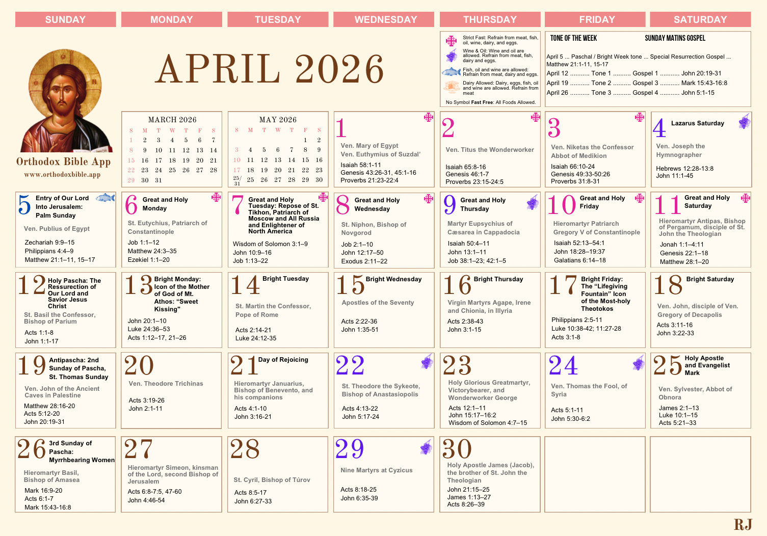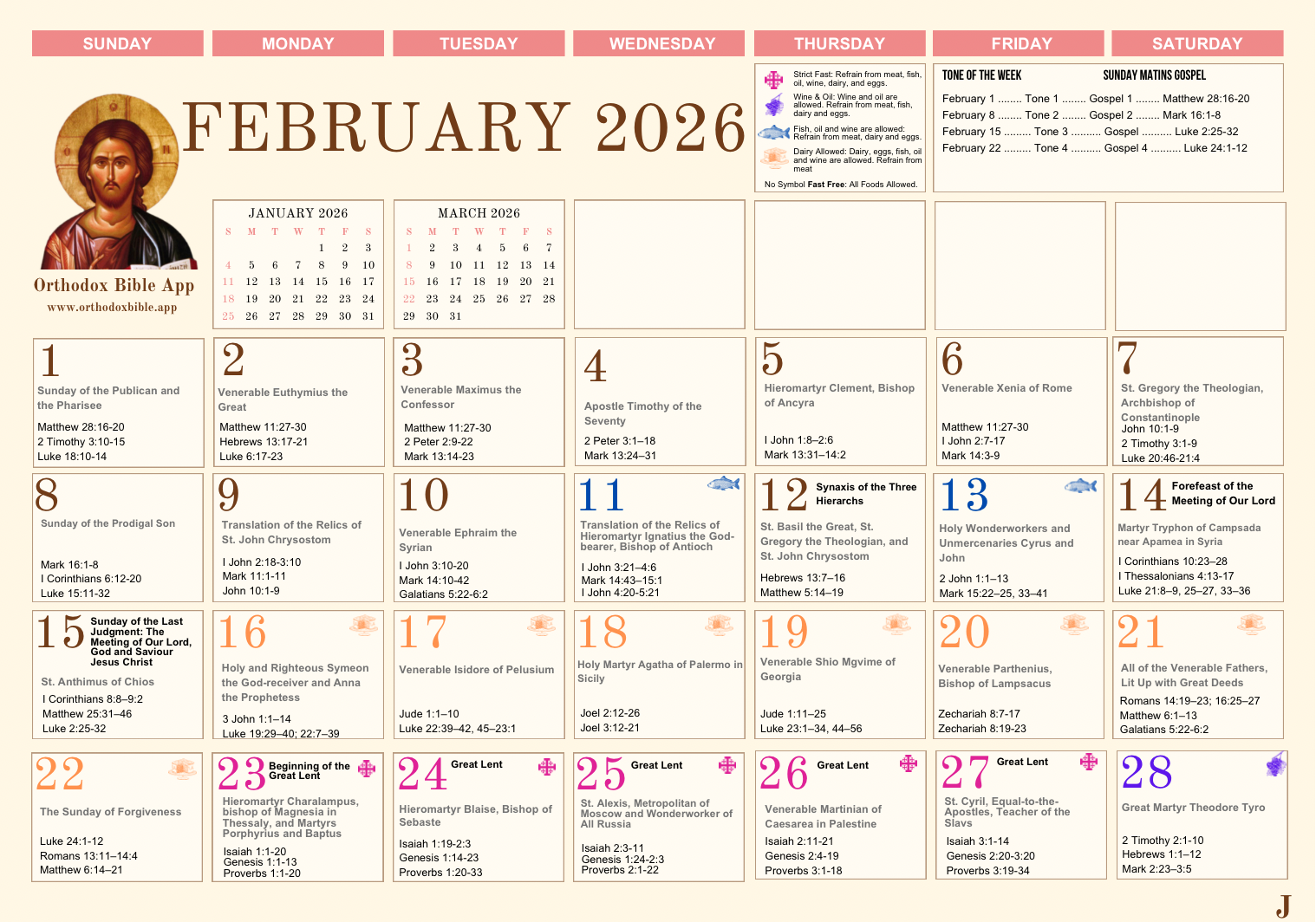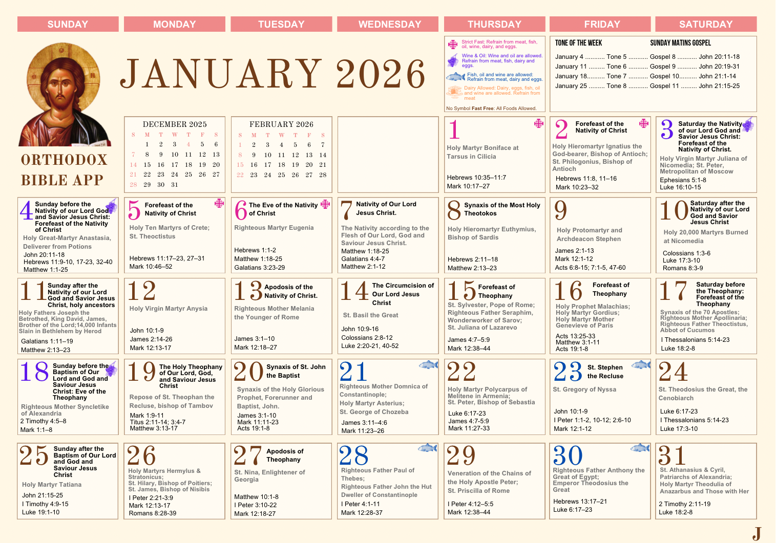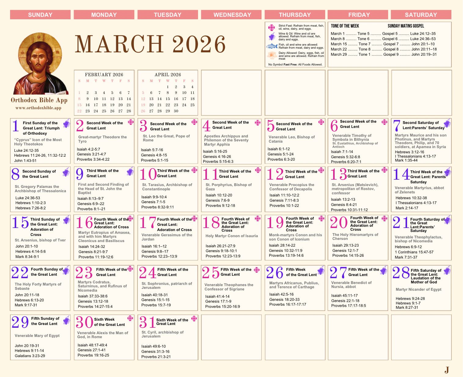 View the full Orthodox calendar with saints, feast days, fasting guides, and daily readings for each month. Tap any month to view full size.