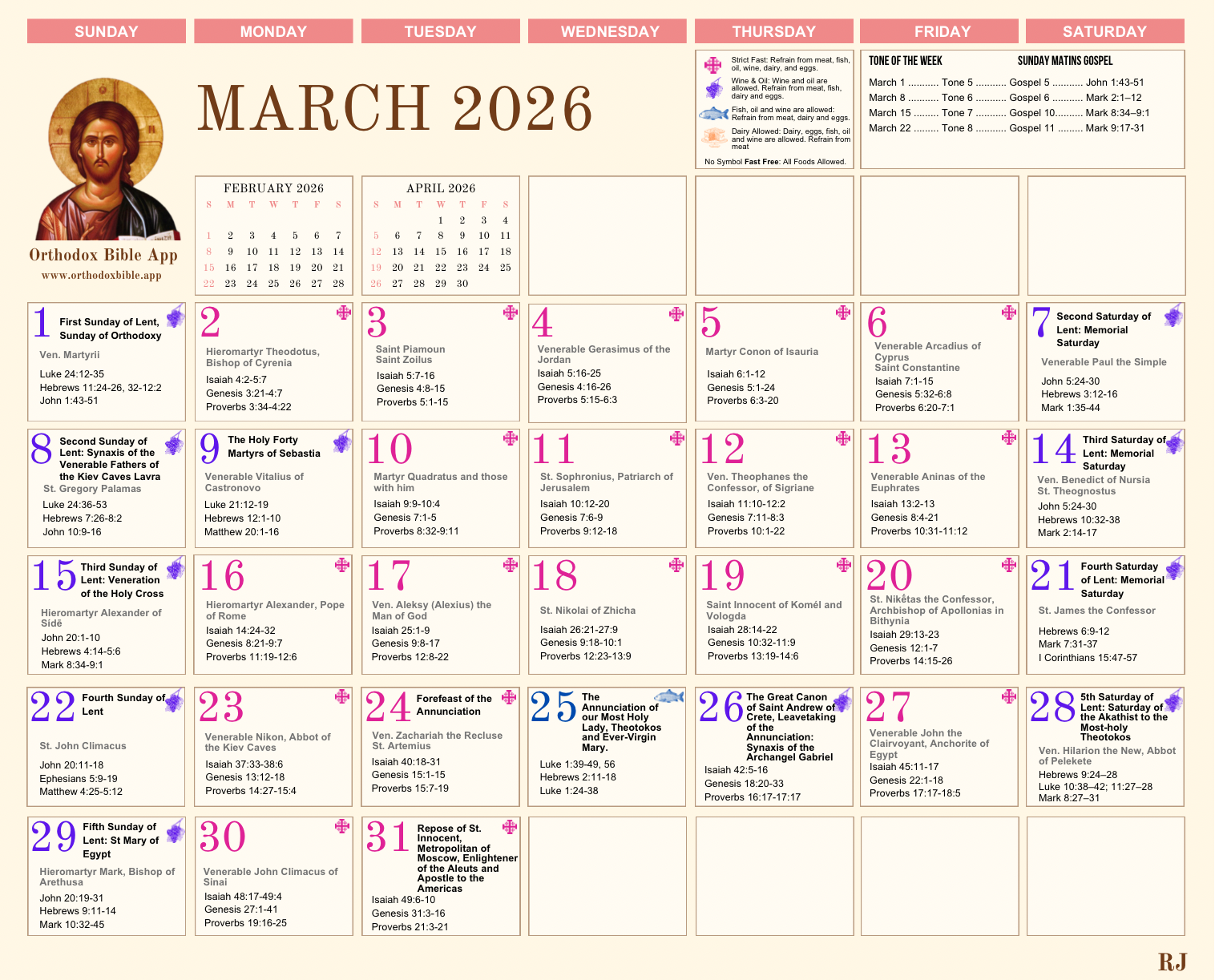 Orthodox Calendar 2026 — Saints, Feast Days & Fasting Guide