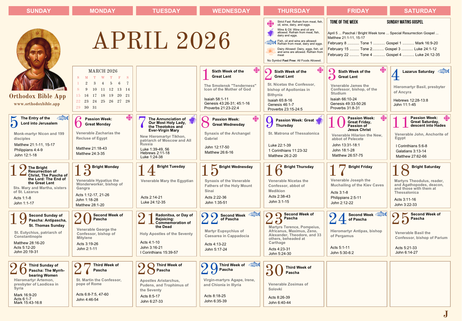 Orthodox Calendar 2026 — Monthly View